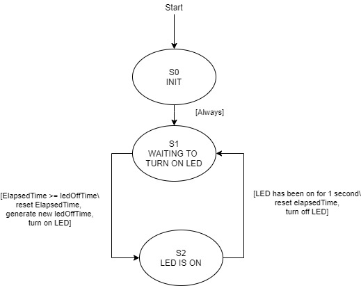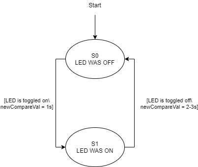 Output Compare: With output compare, a timer channel is set to toggle a specific pin (the LED in our case) whenever a specified output compare value is reached on the count. In terms of code implementation, this requires the timer channel mode to be set to mode = pyb.timer.OC_TOGGLE, as well as a callback to be associated with the compare value being reached. For the ouptut capture callback, a brief state machine was used to differentiate between setting the LED to toggle on after a random time between 2 and 3 seconds, versus setting the LED to turn off after 1 second. In each case, the required interval for the next compare value is added to the previous OC value. See Figure 2.2 below for the associated state transition diagram for the OC interupt.