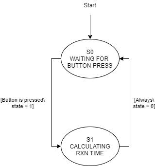 In ME 305, timers and interupt service routines were used frequently. For Part A of this lab, our task was to use the utime module (specifically the methods of utime.ticks_us and utime.ticks_diff) to calculate a user reaction time to an LED flashing. To ensure the user could not predict when the LED would flash, the LED was setup to flash on for 1 second at a time, with a random wait time between 2 and 3 seconds between turning on. This randomization was achieved using the random.randrange() method of the random module. Addtionaly, a simple state machine was utilized, and the corresponding state transition diagram can be found below in Figure 2.1.